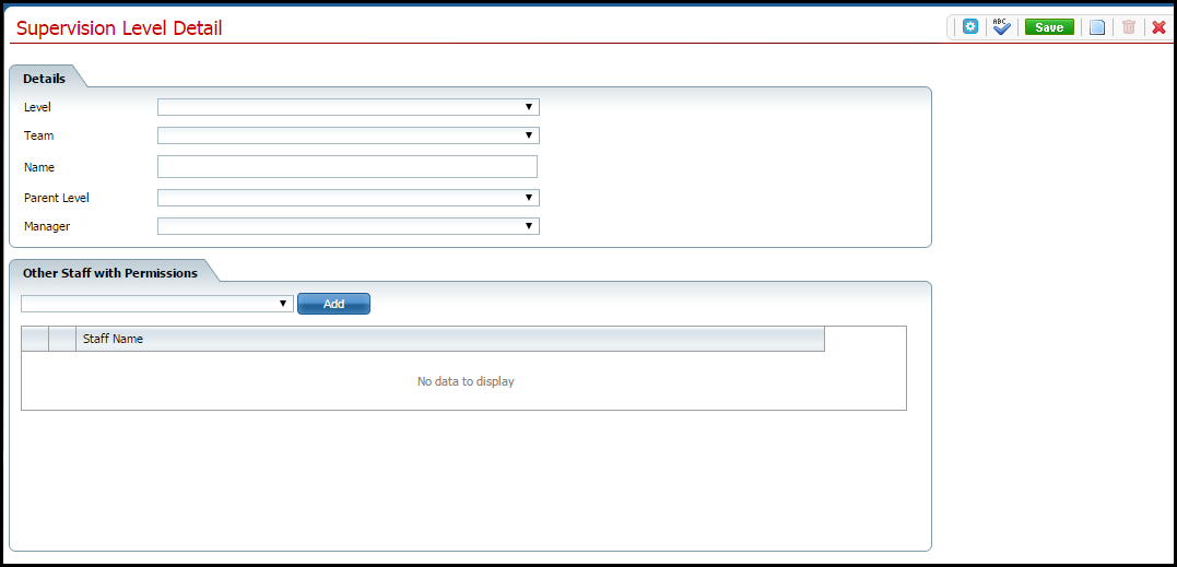 Complete the Details section of the Supervision Level Detail page. Be sure to select the Program level in the Level drop down list.